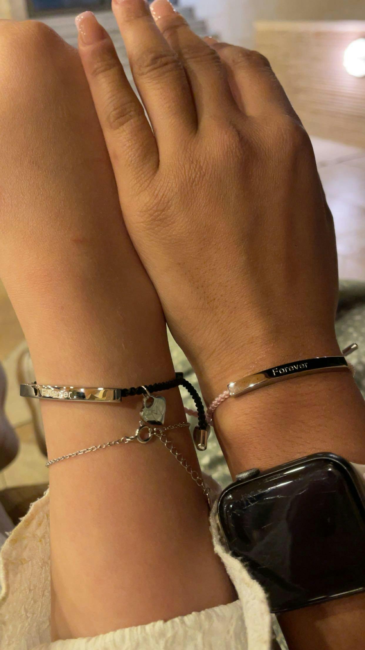 This silver plated set includes 2 bracelets, one in pink and one in black, both engraved with either "promise" or "forever." Each bracelet comes with a card to write and keep your promises to one another as a meaningful gesture.