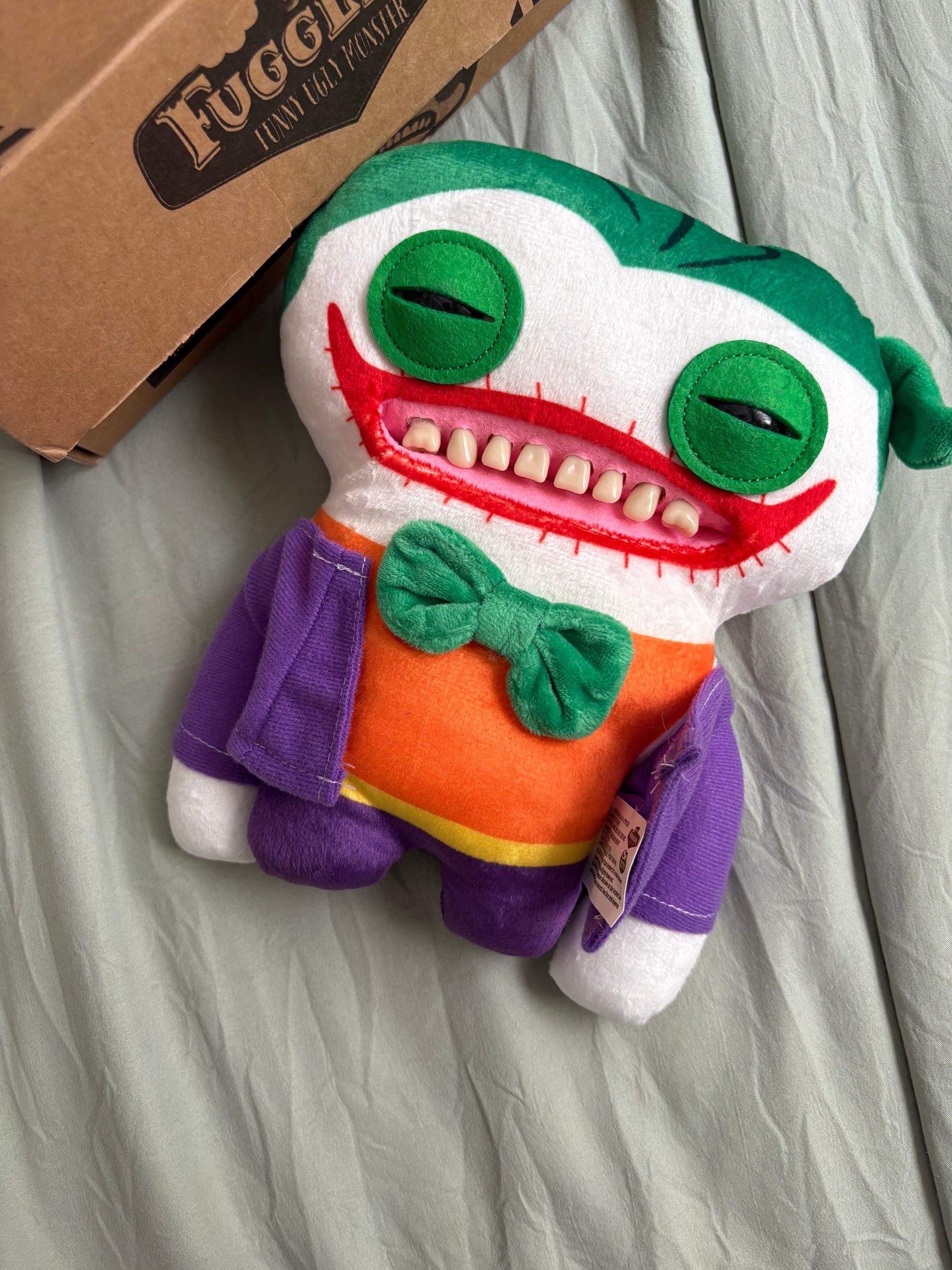 Add a touch of chaos to your collection with this hilarious plush toy! This mischievous little monster features a grinning mouth full of creepy fake teeth, stitched red smile, and sleepy green button eyes that give it a perfectly weird look. Dressed in a purple jacket, orange shirt, and green bow tie, this plush is equal parts creepy, funny, and adorable.