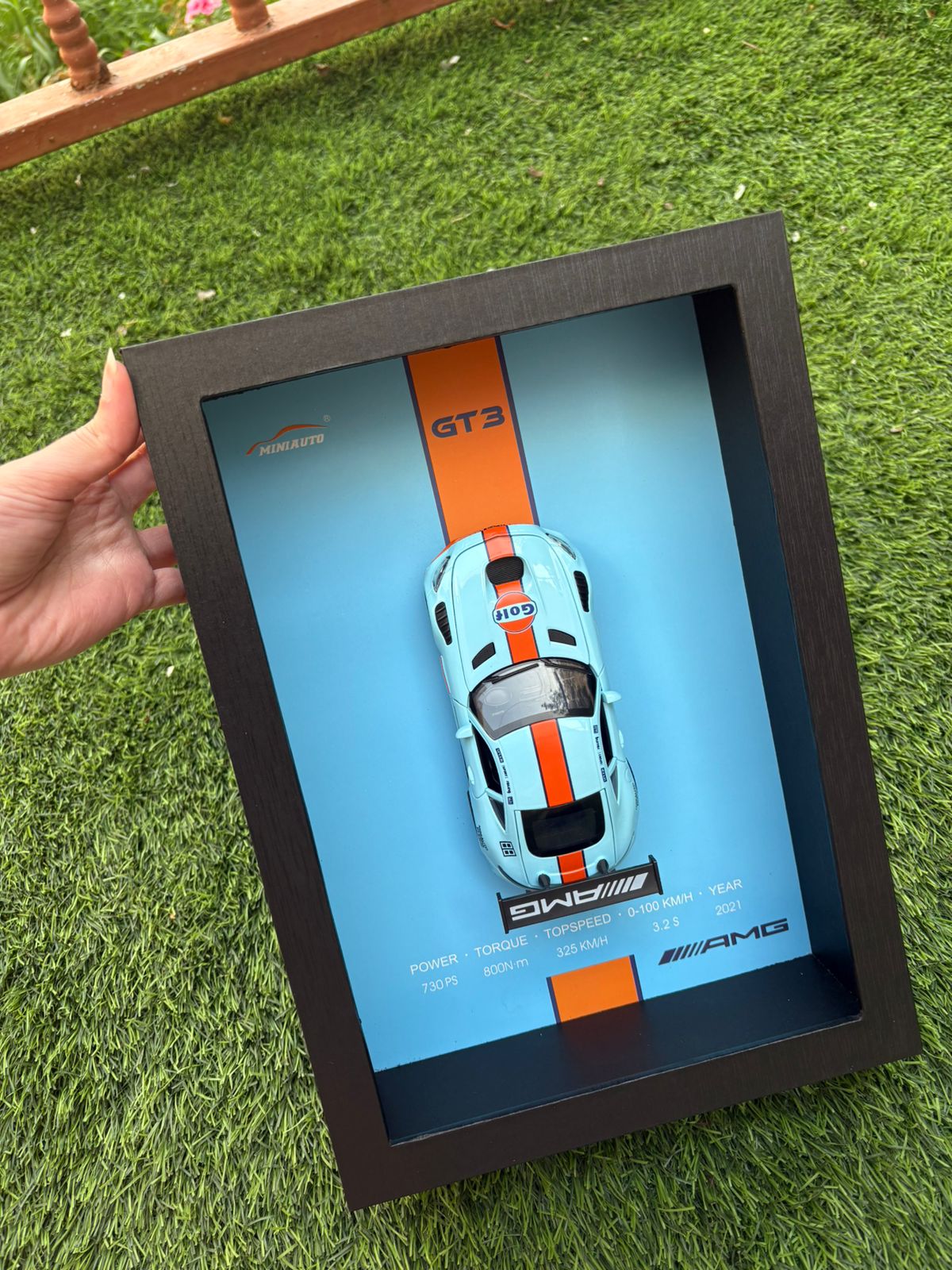 Bring the spirit of the racetrack into your home with this meticulously crafted tribute to the Mercedes-AMG GT3. This framed shadow box captures the perfect intersection of engineering prowess and iconic racing aesthetics, featuring the legendary light blue and orange Gulf-inspired livery.