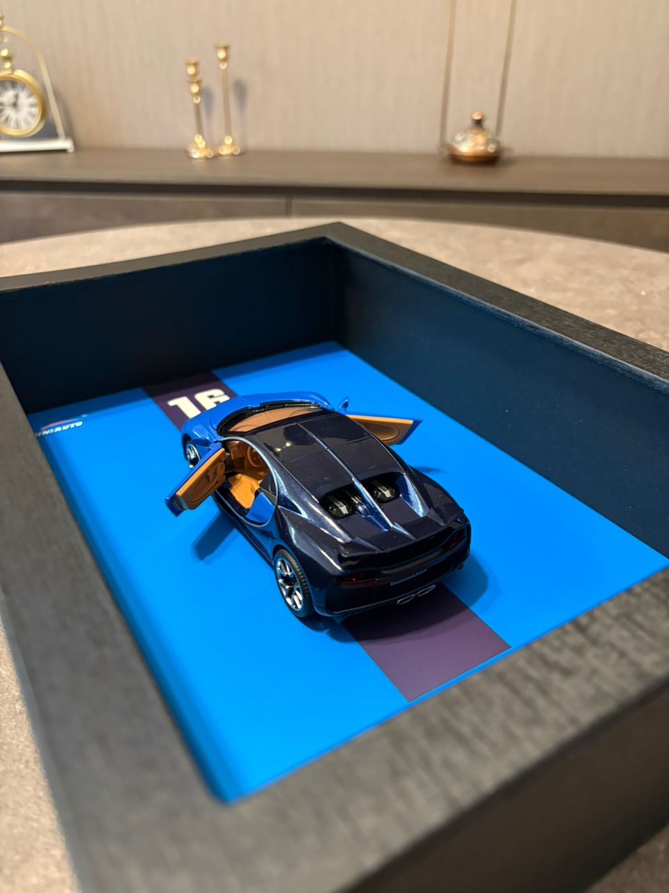 - 3D Visual Impact: Features a tangible, detailed diecast car model (Blue/Black two-tone) rather than a flat poster.
