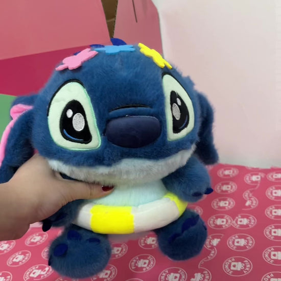 Get ready for a summer of fun with this adorable Summer Edition Stitch Plush! Not only is he dressed for the beach in his cute yellow swim ring, but he also has a special surprise—his tail really moves!